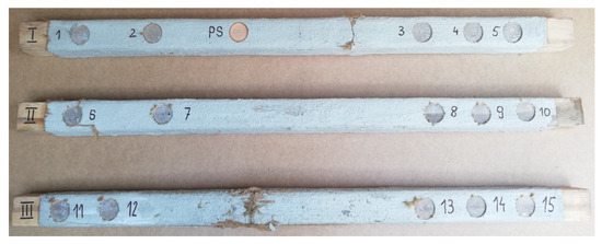 In the second stage, the pull-off strength of the epoxy resin layer, i.e., Resin 55 adhesive, from the timber substrate was determined. The first step was to clean the places of sticking the steel discs from the remnants of the mineral mortar to the layer of Resin 55 resin glue (as shown in Figure 1 and Figure 2) to a depth of 5 mm. The glue Resin 55 (component A/component B) was characterized by the following properties: (i) viscosity at 22 °C of 10,400 cps/80 cps; (ii) tensile strength 36 MPa/72 MPa; (iii) tensile modulus 2220 MPa/2110 MPa; (iv) elongation at break 1.73%/5.89%; (v) flexural strength 63 MPa/126 MPa; (vi) flexural modulus 3660 MPa/3030 MPa; (vii) compressive strength 109 MPa/99 MPa; (viii) compressive modulus 2990 MPa/2690 MPa; (ix) Density 1.15 kg/L/1.15 kg/L. The next step was to degrease the place of sticking the discs and to glue steel discs with a diameter of 50 mm directly into the surface of the tested material. The discs were glued with an adhesive based on Pattex epoxy resin. The thickness of the glue joint was 1 mm. The samples were placed in the same places as in stage I.