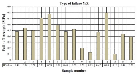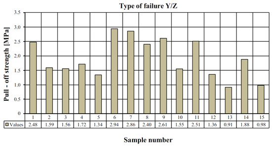 The values of the pull-off strength for the type of substrate failure “Y/Z”.