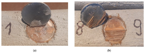 Table 2 shows the pull-off strength values with a description of the destruction for individual tested samples. In all cases, adhesive failure was observed between the adhesive layer and the ‘Y/Z’ disc. In five cases, the disc was detached from the resin substrate, which resulted in no damage to the mineral layer of the composite, which the standard [26] defines as “Y/Z—adhesive damage between the adhesive layer and the disc” (Figure 7). In ten cases, there was a non-standard—partial destruction in the composite layer, which resulted in the disc detaching from the composite substrate. In this case, the percentage of the damaged area was determined visually. Based on the research, the percentage of the damaged area between the adhesive layer and the disc was estimated in the range from 5 to 70% (Figure 7). Table 3 presents a summary of the statistical analysis of the test results. Figure 8 shows the graphical representation of the pull-off strength for the obtained failure type ‘Y/Z’.