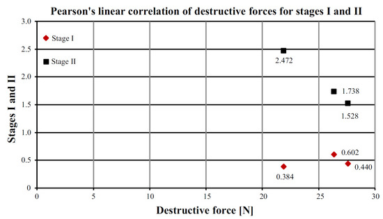 Pearson’s linear correlation for destructive forces and pull-off strength for stages I and II.