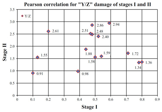The correlation coefficient “r” was calculated in the same way for stages I and II, which was 0.0534. This means that there was no correlation between Stage I and Stage II results. The plot of Pearson’s linear correlation for the “Y/Z” failure types was shown in Figure 12.