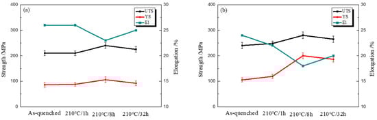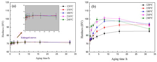 Figure 3 shows the hardness curves of the two alloys aging at different temperatures. For the Ag-free alloy, the hardness changes slightly with aging temperatures and times, as shown in Figure 3a. However, as shown in Figure 3b, the age hardening response is significantly enhanced by the addition of Ag. The hardness of the Al-4Mg-0.6Ag alloy increases sharply with aging temperatures and times. This reflects that there must be some particles precipitated in the aging process, which leads to the increasing of the hardness of the alloy. Additionally, the higher the temperature is, the faster the hardness increases, the shorter the time to reach the peak hardness. In the aging process, the nucleation, growth and coarsening of precipitates are controlled by the diffusion of vacancies and solute atoms. The effect of temperature on precipitates can be expressed by the Arrhenius equation: D = D0exp(−Q/RT) [16]. The diffusion coefficient increases with aging temperatures. Thus, the higher the aging temperature is, the faster the atoms diffuse and the more rapidly the hardness increases. By comparing the hardness curves of the Al-4Mg-0.6Ag alloy at different aging temperatures, the best aging temperature is 210 °C.