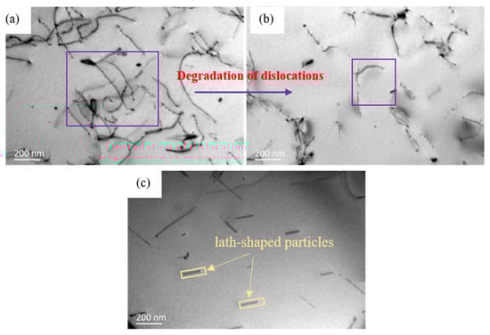 In order to illustrate the effect of Ag on the precipitation strengthening mechanism of Al-Mg alloys, TEM images of the aged Al-4Mg (-0.6Ag) alloys are shown in Figure 4 and Figure 5. For the Al-4Mg alloy, at the early aged stage (210 °C/1 h), the microstructure contains massive dislocations, forming dislocation tangles. There is no precipitated particle in the matrix, as shown in Figure 4a. When aged for 8 h at 210 °C, with the movement of vacancies and dislocations, the opposite dislocations offset each other and the amount of dislocations decrease. There is no particles at this stage, as shown in Figure 4b. At the over-aged stage (210 °C/32 h), in Figure 4c, some lath-shaped particles with dimension of 0.1–0.2μm distribute in the matrix sparsely. According to the morphology of the particles and the precipitation sequence of Al-Mg alloys [4], the lath-shaped particles can be defined as β’ with the component of Al3Mg2. For Al-Mg alloys, the clusters of Mg atoms are unstable and prefer to dissolve at artificial aging temperature. Due to the lack of nucleation sites, it is difficult for nanoparticles to precipitate uniformly. Only few coarse scale β’ phases distribute in the matrix sparsely. Due to the coarse scale and discrete distribution, the β’ phase has little effect on the strengthening of Al-Mg alloys.