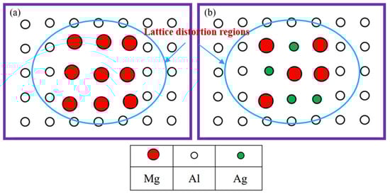 For the Ag-addition alloy, Ag modifies the precipitation process from the earliest stage of the decomposition through a preferred Mg-Ag interaction. After the addition of Ag, the precipitation sequence of Al-4Mg-0.6Ag alloy in this passage can be summarized as follows: GP zones → MgAg phase → T phase (Mg32(Ag, Al)49). After the addition of 0.6 wt.% Ag in the Al-4Mg alloy, as the atomic radii of Al and Ag differ by only 0.5% [22], the lattice distortion of GP zones is alleviated and the elastic strain energy between GP zones and aluminum matrix reduces, as shown in Figure 6b. Therefore, the GP zones can exist in the matrix stably. In addition, Ag is easier to bond with Mg and increased the amount of vacancy, which promotes the formation of GP zones [23]. Numerous GP zones provide nucleation sites for the nanoscale dispersed precipitates. As a result, the strength of the Al-4Mg alloy is improved by the addition of Ag.