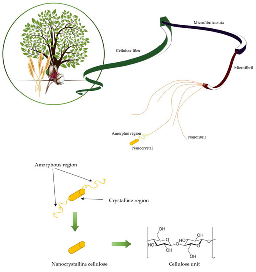 Cellulose nanocrystals (CNC) are known as nanocrystalline cellulose, cellulose whiskers, or cellulose nanowhiskers. CNCs are high-strength nanocellulose typically extracted from cellulose fibers by acid hydrolysis. Acid treatment can remove most amorphous cellulose and produce high-purity cellulose crystals, so CNCs have high crystallinity. CNC contains 64–98% cellulose Iβ, depending on the source of origin, with nearly perfect crystallinity (up to 90%). Morphologically, the CNCs exist in short rods-like shape or whisker shape structures. CNC length and diameter typically range from a length of 200–500 nm to a diameter of 3–35 nm [55,56]. CNCs have unique properties such as high crystallinity, relatively high aspect ratio (10–100), high thermal stability (up to 300 °C), low density (~1.6 g/cm3), low coefficient of thermal expansion, large surface area, high tensile strength, and high tensile modulus (up to 170 GPa). Moreover, CNCs, due to the accessible hydroxyl groups on their surface, can be easily functionalized [38,50].