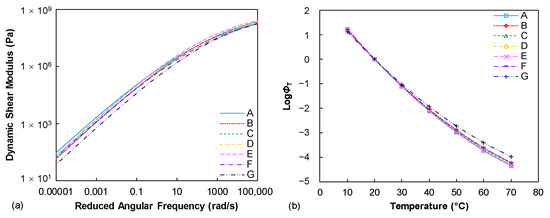 Figure 2a summaries the dynamic shear modulus mastercurves of seven tested binders. Generally, it is observed that these binders show a similar level of dynamic modulus values across the various loading frequencies. This is expected since the penetration grades of those binders are identical. The penetration depth basically reflects the stiffness level of the asphalt binder at a specific temperature condition and the dynamic modulus is also a viscoelastic indicator of the binder stiffness at various loading frequencies and temperatures. However, slight differences can still be found from the dynamic modulus mastercurves, especially at the lower frequency (higher temperature) conditions. The binder A is identified as a stiffer binder when decreasing the loading frequencies while the binder G relatively shows the lowest modulus level. The temperature sensitivity of the tested binders can be described from the temperature shift factor (ϕT) results, as compared in Figure 2b. It can be observed that the ϕT results of the seven binders at lower temperature range are identical to each other, whereas they gradually exhibit discrepancies with the enhanced temperature conditions, especially for the binder G.