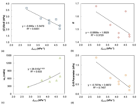 Comparison of Jnr3.2 and LVE parameters: (a) |G*|/sin δ; (b) R; (c) ωc; (d) G-R parameter.