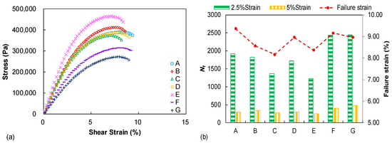 Figure 6a presents the measured stress–strain curves during the LAS test and each curve is displayed up to the identified failure occurrence. The binder E shows the highest peak stress amplitude whereas the binder G exhibits the lowest one. However, it should be kept in mind that the peak stress amplitude does not represent the fatigue potential but only indicates binder stress response under the strain–sweep loading. Figure 6b summarizes the identified failure strain (γf) and predicted fatigue life (Nf) values from the LAS test, in which distinguished failure properties can be observed among the tested binders. Binders A and C, respectively, display the highest and lowest failure strain values. It was previously demonstrated that the failure strain parameter only reveals the binder strain tolerance/flexibility with increasing the strain amplitude in the LAS test and, thus, it is related to the binder fatigue property to some degree but not the full fatigue performance [23]. The strain-controlled fatigue life, which is regarded as a direct and easily understood parameter to reflect fatigue resistance, is simulated under two strain levels (2.5% and 5%) for all tested binders. It can be observed that the tested binders exhibit obvious discrepancies on the fatigue performance and the Nf -based ranking is slightly different to the failure strain evaluation. Binders C and E still show relatively low Nf levels but the fatigue performance of binder F and G is obviously better than that of other binders, especially binder A, which previously showed the highest failure strain. Therefore, it is concluded that the fatigue resistance of the seven unmodified binders with the same penetration grade are still distinguished from each other and the damage-based procedure is needed to achieve a more accurate fatigue characterization.