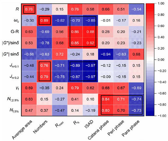 To comprehensively understand the influences of the bee structure and multiple phases on the rheological performance of asphalt binder, eight morphology parameters of three categories were selected and calculated. The test results are listed in Table 2. Further, the Pearson correlation analysis between morphology parameters and performance parameters were conducted and the Pearson correlation coefficients are summarized in Figure 10. It is observed that the average area of bee structures has a positive correlation with R, and the number of the bee structures also shows strong positive correlations with ωc, Jnr0.1, and Jnr3.2, indicating a potential relationship between the bee structure and the stiffness of asphalt binder. In addition, significant correlations (R > 0.8) between roughness-related parameters (Rq and ISAD) and LVE parameters (ωc, G-R and |G*|/sin δ) are observed. Seen from the trends of LVE parameters, the fracture resistance decreases and the rutting resistance increases with the increase in Rq and ISAD. The results indicate the LVE parameters are only affected by the surface structure of asphalt binder instead of material compositions or interactions between particles. This is expected since the LVE parameters are measured under a non-damaged state, where the contact between the plate and asphalt surface has a greater influence than the material itself. However, it is surprising to find that there are very significant correlations (R is around 0.9) in terms of the damage-based Jnr value vs. Rq and ISAD. The Jnr value increases with the increasing Rq and ISAD, indicating a weaker rutting potential, which is consistent with the change in |G*|/sin δ. Moreover, the content of the catana phase shows significant positive and negative correlations with fatigue life and |G*|·sin δ, respectively, which indicates the catana phase contributes significantly to the fatigue resistance nature of asphalt binder. In addition, the content of the peri phase and para phase also show a good correlation (R > 0.7) with fatigue life. The results prove that the fatigue resistance nature of asphalt binder contributes to the content of different compositions of asphalt binder rather than simple surface structure parameters since it is a damage-based index.