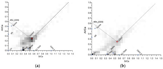 For this purpose, bivariate histograms were constructed with the Si/Ca vs Al/Ca molar ratios (Figure 10). The red dots in the intersection are representative of the C-A-S-H composition, and its average elemental ratios are summarized in Table 5. The different molar ratios reported in Table 5 shows very similar C-A-S-H compositions among the mixtures evaluated through this analysis, and also that in comparison with the typical Al/Ca ratio for ordinary Portland cement (0.05) [30], the ternary Portland cement-filler-metakaolin cementitious systems and the binary cement-metakaolin system presented AL/Ca ratios of 0.20 or higher. It is noted the great aluminum incorporation in the C-A-S-H passing from the 0.05 Al/Ca ratio in normal OPC pastes to more than 0.2. This heavy Al incorporation results from the high kaolinite content in our calcined clay [31]. Wrapping up the results, we could see that the limestone filler is not specially more beneficial when used in conjunction with calcined clays in low water/cement environments, further evaluation with other type of fillers must be done to expand the metakaolin based ternary systems to not only calcite. Nevertheless, the use of any kind of fillers enhances the hydration degree in systems with very low water availability.