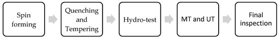 Hydrogen embrittlement in Cr-Mo steel under normal temperature and high pressure has been a topic of considerable interest and many research efforts have focused on the topic. In the evaluation of material hydrogen embrittlement, there is a mature international standard or method [8,9,10,11,12,13,14,15,16]. The publicly available data to support these fatigue- based designs were summarized in just a handful of publications, in particular research by [17,18]. Wada et al. [19] point out that for CSM440 at 45 MPa, ultra-high purity hydrogen at room temperature, the hydrogen brittleness resistance test was carried out. Tensile test results show that the yield strength and maximum tensile strength are not different from those in air, but the toughness is decreased. The measurement of fatigue crack growth rates in gaseous hydrogen at the different design pressures were performed. The fatigue used in the development of the master curve for high-pressure gaseous hydrogen service were reported in several studies in Cr-Mo [20,21] and Ni-Cr-Mo [22,23]. However, there is no research on the mechanism of different hydrogen embrittlement caused by different spinning processes in a high pressure (≥100 MPa) hydrogen environment.