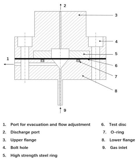 The upper and lower stainless steel flanges are connected by high-strength bolts with a tensile strength of 1100 MPa. The volume of the lower chamber is about 5 cm3, and the maximum inner diameter of the conical surface is 25.5 mm. The diameter of the superior cavity is 25.5 mm. The fillet diameter of the high-strength steel ring is 0.5 mm. In the test facility, the “vent and flow control outlet” and “discharge outlet” ensure the safe discharge of the test gas through pipeline connection.