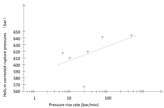 Pr′He is the theoretical helium rupture pressure corresponding to the same pressure rise rate as that for the hydrogen test, which is calculated from the regression equation of the corrected helium rupture pressure. Pr′H2 is the corrected hydrogen rupture pressure.