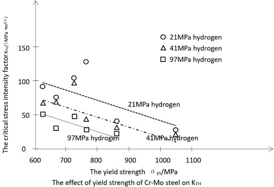 Effect of yield strength on the KTH of chrome-molybdenum steel. The “Solid line” refers to the 97 MPA high-pressure hydrogen environment, the “dashed line” indicates in the 41 MPA high-pressure hydrogen environment, the “dotted line” indicates in the 21 MPA high-pressure hydrogen environment. KTH is the critical stress intensity factor in the fracture mechanics evaluation.
