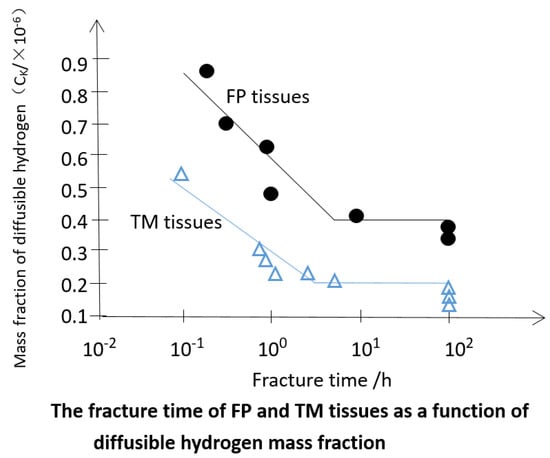 The variation of the delay fracture time of notched samples with two kinds of tissues as a function of the mass fraction of diffusible hydrogen in steel is shown in Figure 9.