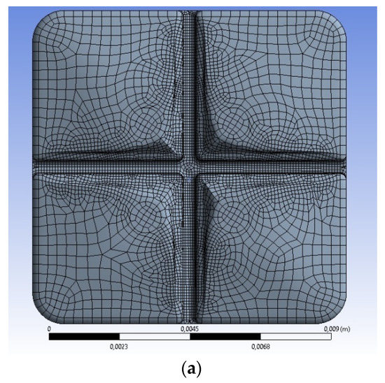 The final number of elements inside the hexagonal mesh is equal to 61,146; the number of nodes 225,652. The obtained mesh is characterized by satisfactory parameters; the single element has an average quality equal to 0.86 (the best is 1, the worst is 0); the standard deviation is 0.27451.