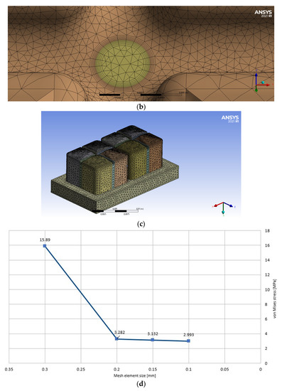 In the case of a single crown (Figure 1d), the change of element mesh size (0.1 mm/0.15 mm/0.2 mm) causes the comparable and negligible increase of von Mises stresses. The corresponding growth from 0.2 mm to 0.3 mm generates a significant drop of stresses; the FE mesh of the model is very coarse, and its quality does not secure the results. The bridge has the more regular increase in stress of the near-asymptotic character (Figure 1e). The change of mesh size (0.025 mm/0.035 mm) causes the negligible increase of von Mises stress equal to 0.007 MPa. The consecutive change of element mesh size (0.035 mm/0.05 mm/0.1 mm) creates the linear growth of stresses. The final increment of mesh (0.1 mm/0.2 mm) generates the decreased drop of stresses equal to 0.136 MPa. The reason is the non-uniform vertical pressure acting on the molar. Its value changes linearly from the maximal 1 MPa on the first molar to 0 on the second. Thus, the near-regular mesh on the part of first molar is subjected to the maximal stresses. The corresponding von Mises stresses are slightly less sensitive to mesh size in this range of dimensions.