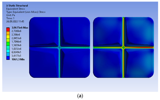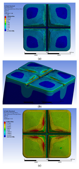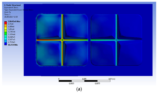 The distributions of all parameters are similar to the rigidly supported bridge, but the values are slightly different. The von Mises stresses are considerably smaller than before (the elastic support, 2.8645 MPa; the rigid, 3.0675 MPa); the maximum is at the same area (Figure 8a). The maximal value of principal stress is equal now to 2.3228 MPa; for the rigid support, 2.5828 MPa (Figure 8b). The displacement of the double bridge with the elastic support is much greater than before (3.1180 × 10−5 m related to 3.6577 × 10−8 m, Figure 8c). The elastic support is also deformed, and the maximal displacement is comparable with the displacement of the bridge (3.0902 × 10−5 m, Figure 8d). The displacements are asymmetric according to transferred load.