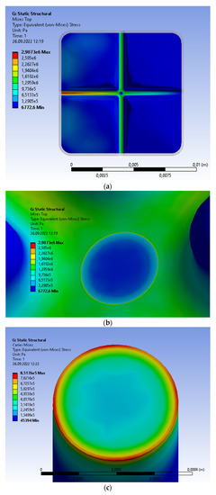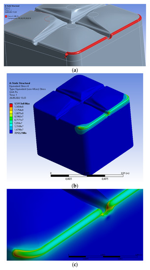 The next analyzed case is the crown subjected to the assumed force of 200 N [15] acting vertically at the edge (Figure 3a). The force generates a linear distribution of load intensity along the edge in respect to the insignificant surface of the acting load. The general view of von Mises stresses presents Figure 3b, whereas the distribution in the central part shows Figure 3c. The maximal stresses are located inside the central groove at its maximal curvature. The maximal value equal to 151.1300 MPa does not exceed the compressive strength for enamel, dentin, periodontium, and zirconium dioxide, although the force is applied on the infinitesimal surface. The maximal displacements are determined at the loaded edge, but the deformation is more regular than the distribution of stresses. The reason is the continuous material and relatively small area of external loads. The maximal displacement is equal to 7.6987 × 10−7 m, and is greater than determined previously, i.e., for the case of the stresses uniformly distributed on the tooth surface.