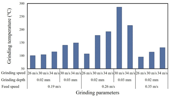 Most of the mechanical work occurring in the grinding process is converted into grinding heat, which increases the temperature of the gear tooth surface. If the thermal stress caused by the grinding process exceeds the yield strength of the workpiece material, residual tensile stress will be generated within the ground surface and it is possible to form dominant or recessive grinding cracks in the surface layer, which severely affect the gear strength and fatigue life [16]. In addition, as the contact arc surface of gear grinding is complex, the grinding temperature changes with the normal grinding depth and presents as a non-uniform form [17]. Thus, the grinding temperature is an important indicator of the workpiece heating state during the grinding process. The highest temperature during grinding under each set of parameters was recorded. Figure 3 shows the variation in grinding temperature under different grinding parameters. It is obvious that a high level of grinding parameters generally led to a relatively higher grinding temperature, with the maximum value of ~290 °C.