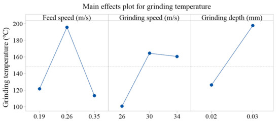Statistical ANOVA method was applied to further analyze significant factors and the related percentage contribution ratio (PCR) for ground temperature. Figure 4 shows the detailed information concerning the main effects plots of grinding temperature related to different grinding parameters. Data from the ANOVA table confirmed that feed speed was statistically significant, affecting grinding temperature with a corresponding percentage contribution ratio of 33.7%, followed by grinding depth, with the details presented in Table 3.