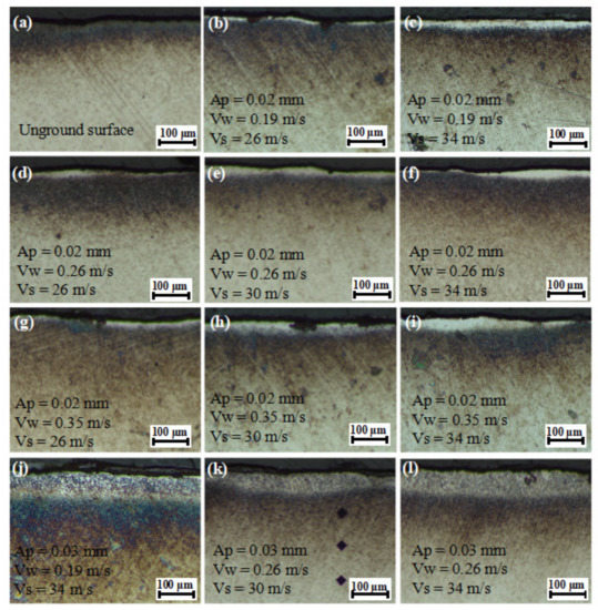 Figure 6 shows the morphology of the subsurface layer after grinding with different parameters. It was found that the bright white ablation layer generally occurred within the subsurface layer after grinding in the depth direction. The white layer was the reinforced structure of the surface material after hardening during abrasive grinding, and it was mainly composed of martensite, cementite, and residual austenite [8]. This phenomenon can be explained by the following reasons. The high temperature generated during grinding promoted the reaching of the austenitic field followed by rapid cooling, and the cooling fluid contributed to the transformation from the austenite to martensite phase [21]. White layer formation was fundamentally dependent on the thermal and mechanical effects of grinding on the workpiece material. These effects were mainly caused by the interaction of grinding tool and workpiece material and were significantly affected by grinding parameters [22].