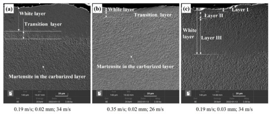 Figure 7 shows the SEM morphology of the ground surface layer under different grinding parameters. The effect of grinding parameters on the thickness of white layer and plastic deformation, which were most likely related to dynamic recrystallization caused by a high temperature and thermal stress during the grinding process [8]. This phenomenon caused higher hardness of the surface layer, which easily caused microcracks. Coarse-grained acicular martensite was observed at the interface between the white layer and original workpiece material, which might be the transition zone formed by the gradual weakening of thermal influence in this zone. The thickness of the white layer in Figure 7c reached ~100 μm, which could be divided into three levels. The outmost layer (layer I) was presumed to be a plastic deformation layer, and the microstructure was difficult to observe and was probably produced by abrasive particles of high-speed cutting at a high temperature. Layer II was composed of fine-grained martensite and possibly carbide particles precipitated by a high temperature. Owing to thermal and mechanical effects, the grains generated a series of dislocations and fragmentation, and finally formed the special layer after cooling [8]. In layer III, the martensite grains became coarse and retained austenite was observed, indicating that the quenching effect might be caused by a high level of the grinding temperature. In fact, when the temperature was above the austenitic transformation point and cooled rapidly, the martensitic microstructure would be generated [24].