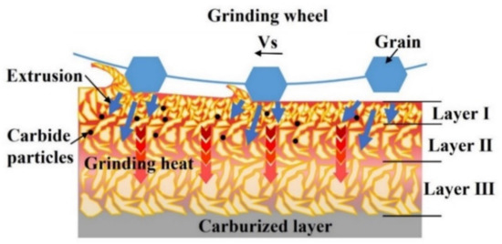 There were two main reasons for the generation of the white layer during grinding quenched transmission gear; one was phase transformation caused by a high temperature and rapid cooling and the other one was plastic deformation caused by grinding abrasives [22]. Figure 8 shows the schematic of the formation mechanism of layer I, layer II, and layer III. When the temperature did not reach the austenite transformation point, the white layer could be formed by plastic deformation [24]. In the surface layer, owing to the strong mechanical extrusion caused by the increase in grinding depth, the material was plastically deformed and the refined grains formed layer I. Below this layer, the plastic deformation gradually decreased and, with the influence of grinding heat, a relatively obvious fine-grained martensite structure was generated, and it became the main composition of layer II. When grinding heat continued to be conducted to the subsurface, the influence of mechanical extrusion could be ignored and resulted in phase transformation during the rapid cooling process; subsequently, part of austenite transformed to martensite, forming layer III. The final properties of the surface layer were determined by the combination of work hardening caused by abrasive extrusion and heat softening caused by grinding temperature [20]. It was found that, with aggressive parameters, especially large grinding depths, undesirable grinding burn would occur on surface layer owing to the dominance of mechanical extrusion and thermal effects. The micro-structural transformation of surface layer material led to the deterioration of material properties, which ultimately caused the decrease in the surface rolling relief fatigue strength [22].