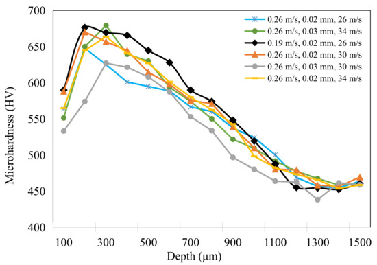 Figure 9 shows the microhardness variation of ground surface with different grinding parameters. Before grinding, the workpiece material had a very high carbon content (≥0.35 wt.%) owing to the existence of the carburized layer, which resulted in the high hardness of surface layer, and quenching treatment led to compressive stress on the surface. The microhardness gradually decreased with the depth below surface, and finally reached the value of base material (450 HV to 460 HV) [25]. The difference in the hardness gradient after grinding could be easily observed through the variation in the microhardness curves. The hardness decreased within a 200 μm thickness owing to the influence of grinding temperature, which resulted in heat softening in this depth range [26]. The softening effect was more pronounced with a grinding depth of 0.03 mm and grinding speed of 30 m/s and 34 m/s. This was in agreement with the theory of thermal softening during the grinding process, as high temperatures were more likely to be generated at a higher grinding depth and speed [27,28]. When the grinding depth was reduced to 0.02 mm, owing to the relatively low grinding temperature, the effect of thermal softening was difficult to observe and the work hardening could be found from the hardness gradient curve. With a relatively low level of grinding parameters, the highest microhardness value reached 680 HV at the depth of 200 μm, which normally formed at the place in which the most drastic plastic deformation took place because of the removal of materials under a high grinding pressure. The occurrence of work hardening and thermal softening was related to the grinding parameters. According to the findings from Ding et al. [29], a competing process between thermal softening and work hardening occurred when the workpiece material was subjected to a high grinding temperature and large grinding pressure. In this work, aggressive grinding parameters produced a higher grinding temperature and the effect of thermal softening on the hardness gradient was obvious, while a low level of grinding parameters weakened the thermal effect and contributed to grain refinement under mechanical extrusion [30].