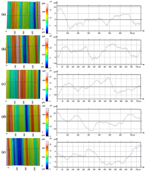 Ground surface profile under different grinding parameters (feed speed, grinding depth, and grinding speed): (a) 0.19 m/s, 0.02 mm, and 26 m/s, respectively; (b) 0.19 m/s, 0.02 mm, and 34 m/s, respectively; (c) 0.19 m/s, 0.03 mm, and 30 m/s, respectively; (d) 0.26 m/s, 0.02 mm, and 26 m/s, respectively; and (e) 0.35 m/s, 0.02 mm, and 34 m/s, respectively.