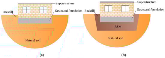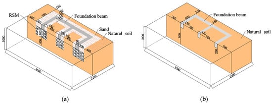 The foundation soil model was completed in the soil box and prepared through the divided compaction method. The soil box was a laminated shear box. The foundation soil model of the GSI–RSM and non-isolation test is shown in Figure 4. The figure shows that the total thickness of the soil layer in the foundation soil model was 1000 mm, and the entire buried depth of the structural foundation was 200 mm. The foundation soil model of the non-isolation test was composed of natural soil, while the foundation soil model of the GSI–RSM test was comprised of natural soil, sand, and RSM. The non-isolation test foundation soil model produced a 1000 mm thick natural soil foundation according to the layered compaction method, involving layer compaction and scraping, where each layer of soil was 200 mm thick, and finally natural soil was backfilled around the foundation beam. The GSI–RSM test foundation soil model first produced a 1000 mm thick natural soil foundation, and then a foundation trench with a depth of 600 mm was excavated based on the natural soil foundation, and then a 400 mm thick RSM was uniformly laid in the foundation trench. Finally, the sand was backfilled around the foundation beam.