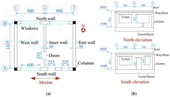 A common kind of masonry structure in rural areas of China with structural columns, ring beams, and other seismic measures was selected as the prototype structure. The plane size was 7200 mm × 5700 mm, and the total height of the house was 3300 mm. According to the length similarity relationship, the plane size of the structure model was 1800 mm × 1425 mm, and the total height was 825 mm. The structural model plane and elevation are shown in Figure 3, and the vibration direction was east–west. The structural model mainly included a brick wall, structural column, ring beam, roof plate, and foundation beam. The plane size of the roof was 1920 mm × 1545 mm, and the thickness was 50 mm.