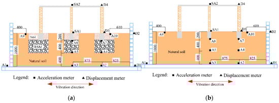 The acceleration and displacement sensors were mainly adopted in the shaking table test. The acceleration sensor was a piezoelectric acceleration sensor, and the displacement sensor was a wire-pull displacement meter. To obtain the dynamic response of the model, acceleration and displacement sensors were arranged on the shaking table, at different depths of the soil layer, on the structural model foundation and the roof panel. The arrangement of acceleration and displacement sensors in the GSI–RSM test and non-isolation test is shown in Figure 5. The acceleration sensor is represented by the letter A or SA to distribute acceleration sensors in soil layers and structural models, and the displacement sensor is represented by the letter D.