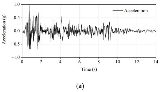 The test was conducted in the Key Laboratory of Earthquake Engineering and Engineering Vibration, Institute of Engineering Mechanics, China Earthquake Administration. The site where the prototype structure was located was class II. According to the Code for Seismic Design of Buildings (GB50011-2010) [27], the north–south component of the EL Centro seismic wave recorded in California in 1940 was selected as the input ground motion, and horizontal (east–west) excitation was carried out on the model. The acceleration amplitude of the original EL Centro seismic wave (north–south component) was adjusted to 1.0 g, and the time-holding was compressed according to the time similarity relationship. The adjusted acceleration, displacement time–history curve, and Fourier spectrum of the input ground motion are shown in Figure 6. Before the test, white noise was inputted to sweep frequency, and then seismic waves with acceleration amplitudes of 0.1 g, 0.2 g, and 0.4 g were inputted in turn. The loading sequence of each ground motion intensity is shown in Table 2.