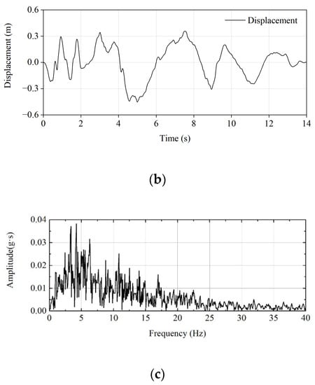 Characteristics of the input wave: (a) time history curve of acceleration; (b) time history curve of displacement; (c) acceleration Fourier spectrum curve.