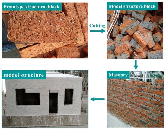 The block material of the prototype structure was a sintered ordinary brick with MU10 strength grade and 235 mm × 115 mm × 45 mm size. To make the structural model blocks using the same material as the prototype structure blocks, the lengths and widths of the bricks were cut according to the proportion of the length similarity ratio. Considering the limitation of construction conditions, the bricks were cut in the thickness direction according to the proportion of 1/2. After cutting, the brick size of the structural model measured 56 mm × 26 mm × 21 mm. The production process of the structural model is shown in Figure 7.