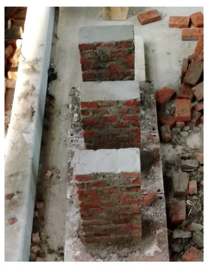 In making the structural model, three masonry specimens were built (see Figure 8). The size of each specimen was 180 mm × 275 mm × 85 mm, and the height/thickness ratio was about 3.2. After curing, the elastic modulus test was carried out on the pressure testing machine. According to the standard test method for basic mechanical properties of masonry (GB/T50129-2011) [28], the secant modulus of the data point when the stress is 0.4 times the peak compressive stress was taken as the elastic modulus of the specimen. The compressive strength and elastic modulus of the masonry specimens are shown in Table 3.