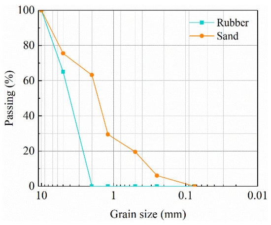 The foundation soil model includes natural soil, sand soil, and waste tire rubber particles. The natural soil was selected as silty clay of a construction site, and the sand was selected as river sand. The particle size range of waste tire rubber particles was 3–6 mm. The gradation curves of sand and rubber particles are shown in Figure 9. The non-uniformity coefficient and curvature coefficient of sand were 10.37 and 0.0247, respectively, and the non-uniformity coefficient and curvature coefficient of rubber particles were 2.025 and 0.858, respectively. RSM was prepared by mixing rubber particles with sand according to volume (see Figure 10), where the volume ratio of rubber particles to sand was 1:4. The basic physical and mechanical parameters of natural soil and RSM are shown in Table 4. The curves of dynamic shear modulus ratio and damping ratio of natural soil and RSM with shear strain are shown in Figure 11.