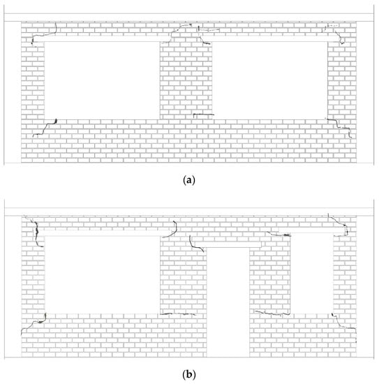 Figure 12 shows the seismic damage of the structural model in the GSI–RSM test after loading. It can be seen that the structural model had no visible cracks. For the non-isolated test, no visible cracks were observed in the structure after the seismic loading with acceleration amplitudes of 0.1 g and 0.2 g. However, after the seismic loading with an input acceleration of 0.4 g, slight cracks appeared in the structure, and the complete crack distribution is shown in Figure 13. It can be seen that cracks mainly appeared in weak parts, such as doors and windows. Obviously, by comparing the macro seismic damage of the structural model in the non-isolation test and the GSI–RSM test, it can be seen that rural houses with a GSI–RSM system can effectively avoid the occurrence of brick wall cracks and reduce the structural damage of the superstructure.