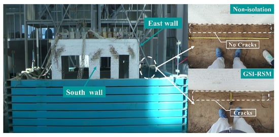 During the test, when the acceleration amplitude of 0.1 g and 0.2 g seismic loading was completed, the backfill part of the two groups of tests did not produce significant damage. The acceleration amplitude of 0.4 g seismic load after the completion of the backfill damage is shown in Figure 14. Obviously, in the non-isolated test, after the whole seismic loading, there was no obvious damage to the backfill soil, indicating that there was no obvious relative slip motion between the structural foundation and the foundation soil in the non-isolated test. However, in the GSI–RSM test, cracks appeared in the backfill portion. According to the analysis of the causes, the relative slip motion between the structural foundation and the RSM layer was generated under the action of the horizontal earthquake, and the structural foundation and the backfilled sand collided and were squeezed by each other, gradually forming cracks.