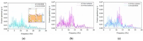 Fourier spectrum of measuring points: (a) GSI–RSM test; (b) non-isolation test; (c) comparison between non-isolation test and isolation test.