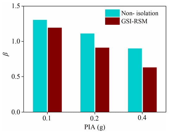 The transfer coefficient of the acceleration response from the soil layer to the structure is shown in Figure 17, in which the acceleration response recorded at measuring points SA1 and A8 in the structure and soil layer were, selected respectively. It can be seen that when the input acceleration amplitude was 0.1 g, the acceleration transfer coefficient of the GSI–RSM test and the non-isolated test was the same. When the input acceleration amplitude was 0.2 g and 0.4 g, the transfer coefficient of the acceleration response from the soil layer to the structure decreased gradually, and the transfer coefficient of the GSI–RSM test was 13.3% and 26.6% lower than that of the non-isolation test, respectively., which shows that the GSI–RSM system limited the transfer of seismic motion to the upper structure and reduced the seismic input of the structural basement. Combined with the analysis of experimental phenomena, RSM had the characteristics of low modulus and large damping. In the GSI–RSM test, RSM filtered part of the high-frequency components of the seismic transmission to the upper structure and produced friction slip in the interaction with the structural foundation, which consumed more seismic energy and reduced the transmission of seismic energy to the upper structure.