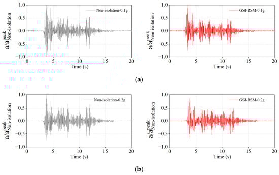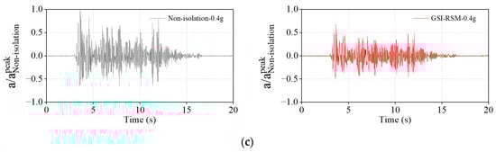 The acceleration time–history curve of the structural roof panel is shown in Figure 18; here, the acceleration was the normalized acceleration value of the peak acceleration through the non-isolation test. It can be seen from the diagram that when the input acceleration amplitude was 0.1 g, the peak acceleration response of the structural roof panel in the GSI–RSM and non-isolation tests was the same. When the input acceleration amplitudes were 0.2 g and 0.4 g, the peak accelerations of the structural roof panel in the GSI–RSM test were only 85.1% and 68.7% of those in the non-isolation test; that is, the peak accelerations of the structural roof panel were reduced by 14.9% and 31.3%, respectively. With the increase of the input acceleration amplitude, the reduction of the acceleration response of the GSI–RSM system to the structural roof panel was also gradually increased.