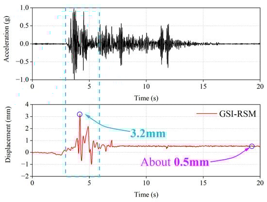 The relative displacement time–history curve between the structural foundation and the RSM layer represents strong evidence to determine whether a slip has occurred between the structure and the RSM layer. At the same time, the maximum slip and the residual slip during the slip process can be seen through the time–history curve. The residual slip can show the re-centering ability of the GSI–RSM system, which determines the usability of the structure after the event.