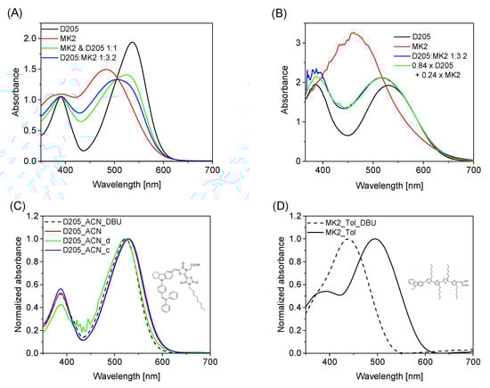 Carbazole and indoline dyes are popular efficient dyes used in DSSCs. In particular, the best reported DSSC photon conversion efficiencies (PCE) for the two dyes investigated in this work—MK2, belonging to the carbazole derivatives [], and D205, an indoline derivative—are 9.7% [] and 9.5% [], respectively. Figure S1 (and insets in Figure 1) shows the structures of both dyes. Solar cells with the above dyes (but not their mixture) have been recently extensively studied by us using time-resolved spectroscopic methods [,,,,]. Due to the differences in the absorption spectra of both dyes, it is possible to improve the spectral response in the range of ~400 nm and ~500 nm, in which a lower absorption of the D205 dye is observed and, at the same time, the absorption maximum of MK2 is located. In addition, we demonstrate the formation of the anionic forms of the MK2 and D205 dyes in various organic solvents. The anionic form is formed by deprotonation of the carboxyl group, which is simultaneously the unit anchored to the TiO2 surface. Experimental studies were supplemented with the results of theoretical calculations using the DFT and TD-DFT methods, which revealed the difference in electronic structure between the anionic and neutral forms of the studied dyes.