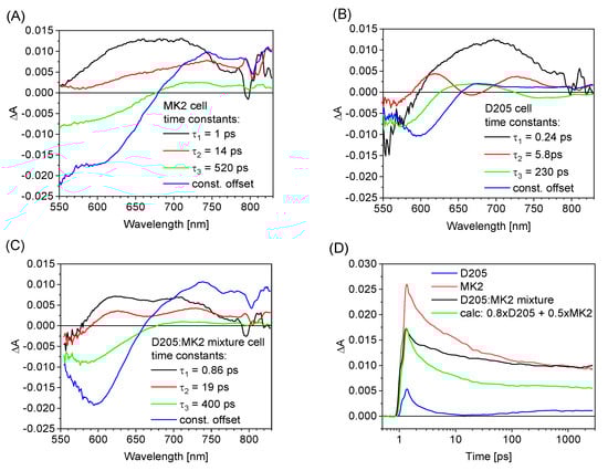 In this section we will also present the results of femtosecond transient absorption studies of the cells with the dye mixture. The transient absorption of the cells was measured upon excitation at 470 nm and globally analyzed in a spectral range from 560 to 830 nm and in a temporal window of up to 3 ns. Figure 2A,C shows the wavelength-dependent amplitudes of the fitted components (3-exponential fit with constant offset) and the corresponding time constants of the exemplary cells with only D205, only MK2 and their mixture, respectively. The relative error of the given time constants is less than 10%. The interpretation of the results for the cells with single dyes is performed along the same lines as in our earlier studies of indoline [,,] and carbazole dyes [,,,]; therefore, it will be only briefly summarized here. In the cells with MK2 only (Figure 2A), the electron injection takes place on a fast time scale, within the first component (1 ps) and partially within the second component (14 ps). The third component of the fit for MK2 cells (520 ps) has the same spectral shape as that of the constant offset component; therefore, it is assigned to the partial recombination of the injected electrons from TiO2 to the oxidized dye. The fastest component for D205 (Figure 2B) of a time constant close to that of the IRF (0.24 ps) is due to the decay of the initially excited (Franck–Condon) state (also called the locally excited, or LE, state). The second (6 ps) and the third (230 ps) time constants were assigned to the decay of the subsequent charge transfer (CT) state of the indoline dye (hot and cold), respectively. Its decay is due to electron injection and undesired self-quenching of CT states. The residual spectrum (constant offset component) is proportional to the successfully separated charges and contains the contributions of the ground state depopulation (bleach, negative signal below 650 nm) and the absorption of oxidized dye and electrons into TiO2 (positive signal above 650 nm).