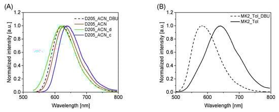 Fluorescence spectra of D205: (A) in ACN at different concentrations or with addition of DBU, (B) MK2 in Tol solution or with addition of DBU; λexc = 480 nm (MK2) or 525 nm (D205). Fluorescence spectra of D205 in the other organic solvents considered are included in Figure S6.