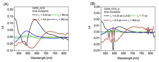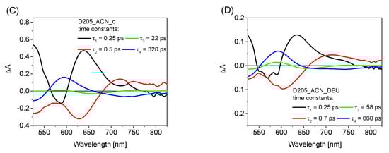 To acquire more information about the solvation times and excited-state lifetimes, a global analysis of transient absorption spectra was performed. Figure 4 shows the wavelength-dependent amplitudes of the fitted four exponential components and the corresponding time constants for D205 in ACN at different concentrations and after DBU addition, both in the VIS and NIR ranges. The results for the other solvents are given in Figures S10–S15. The interpretation of the time constants follows that presented in our previous papers [,,]. In all solvents studied except for Tol, the two fastest components of the wavelength-dependent amplitudes are due to the ultrafast decay of the LE state and solvation dynamics. Solvation times increase in this order, from the shortest to the longest: ACN (below 1 ps), DCM, THF, EtOH and finally tert-Bu. In the latter solvent, the remarkably slow solvation with the longest component of >100 ps (which influences the third component in the global analysis) should be emphasized. The longest components represent the decay of the CT state (LE in the case of Tol). Their dependence on D205 concentration and DBU addition is fully consistent with the findings from the single-wavelength kinetics (in Table 3). For ACN (Figure 4) the lifetime increases from that for the most concentrated sample (dominated by the neutral form) to that of the most diluted one, which shows the same lifetime as for D205− (the samples with DBU). For DCM (Figure S11), whose neutral form is present for all D205 concentrations, the lifetimes are the same and significantly longer than upon addition of DBU. For EtOH with the domination of D205−, the lifetimes with DBU and without it are the same (Figure S12). Interestingly, the concentration-dependent measurements in tert-Bu reveal that the CT lifetime slightly increases upon dilution up to the values obtained for D205_tert-Bu_DBU (Figure S15). This indicates that, despite having a higher β parameter (0.94 in tert-Bu vs. 0.75 in EtOH) not all dyes exist in the anionic form at moderate concentrations in tert-Bu. Most probably, the anionic form is additionally stabilized by the higher polarity of the solvent because its dielectric constant is significantly higher in EtOH (24.5) than in tert-Bu (10.9).