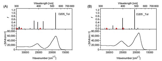 Absorption spectra of D205 (neutral, (A)) and D205− (anion, (B)) in Tol. Predicted transition energies and oscillator strengths f are indicated by solid vertical lines. The (prohibited) transitions involving the n,π* singlet states are marked by red triangles. The results obtained for D205 in the other organic solvents are included in Figure S16. All theoretical results were determined at the b3lyp/6–31G(d) level of theory.