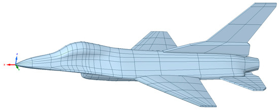 The finite element analysis software Gid (official version 15.0) is utilized to obtain the unstructured meshing. To save the bandwidth occupied by the finite element calculation of the computer memory resources, the meshes of the nose, cockpit, and tail nozzle parts with large changes in the surface curvature of the model are refined, and the mesh size of the remaining parts is set to 0.2, which can be seen in Figure 3.